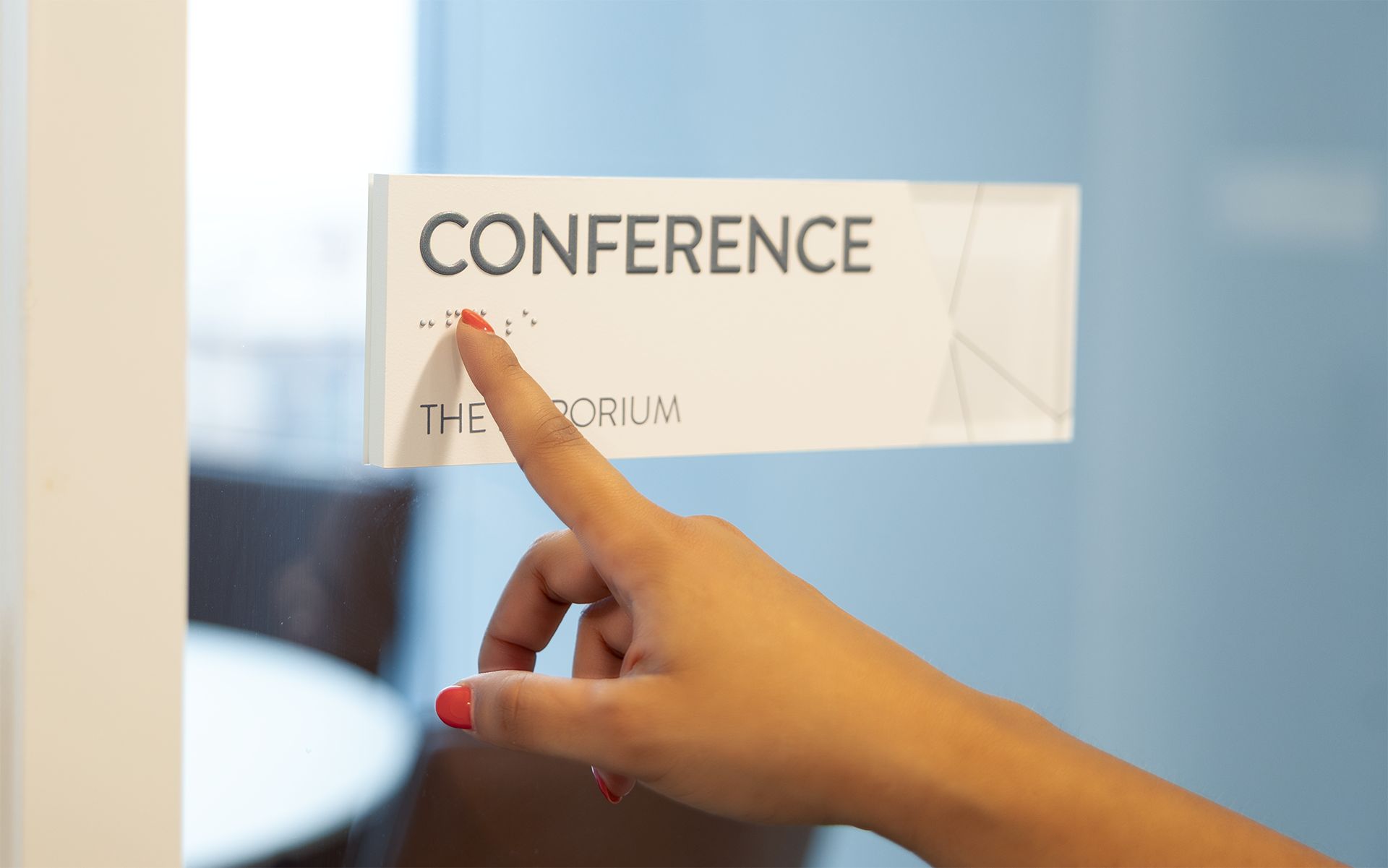 Throughout the office, ADA and workstation signs follow a quieter palette, intentionally stepping back from the brand’s more vibrant tones so they integrate seamlessly with the interior design. The result is signage that’s functional and accessible, without interrupting the visual flow of the space.