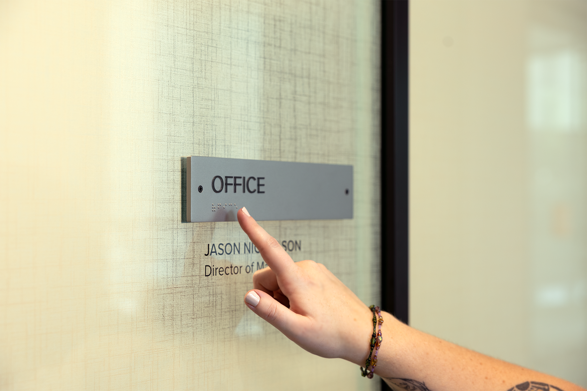 Inspired by musical instruments—specifically the glockenspiel—we designed a complete ADA sign system that is elegant, functional, and compliant. Thoughtful donor recognition adorns each office; plotted vinyl and custom-cut blackened steel tactile text subtly echo the design details throughout the space.