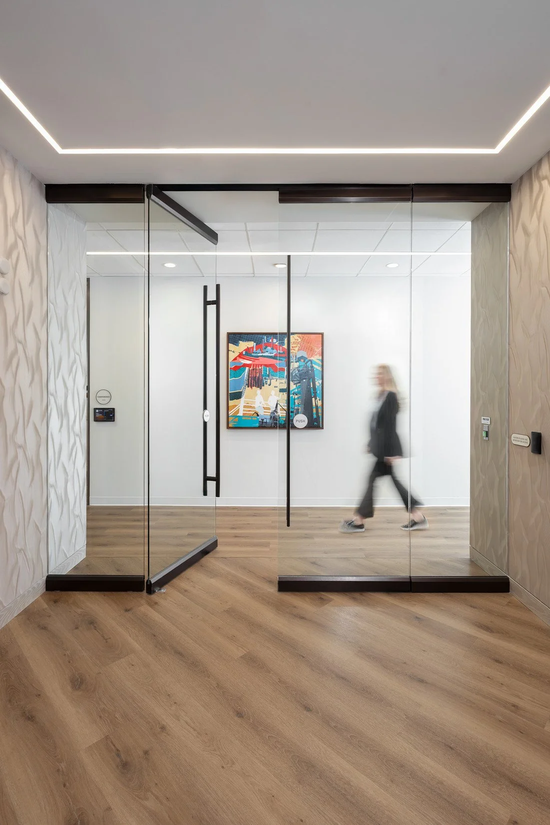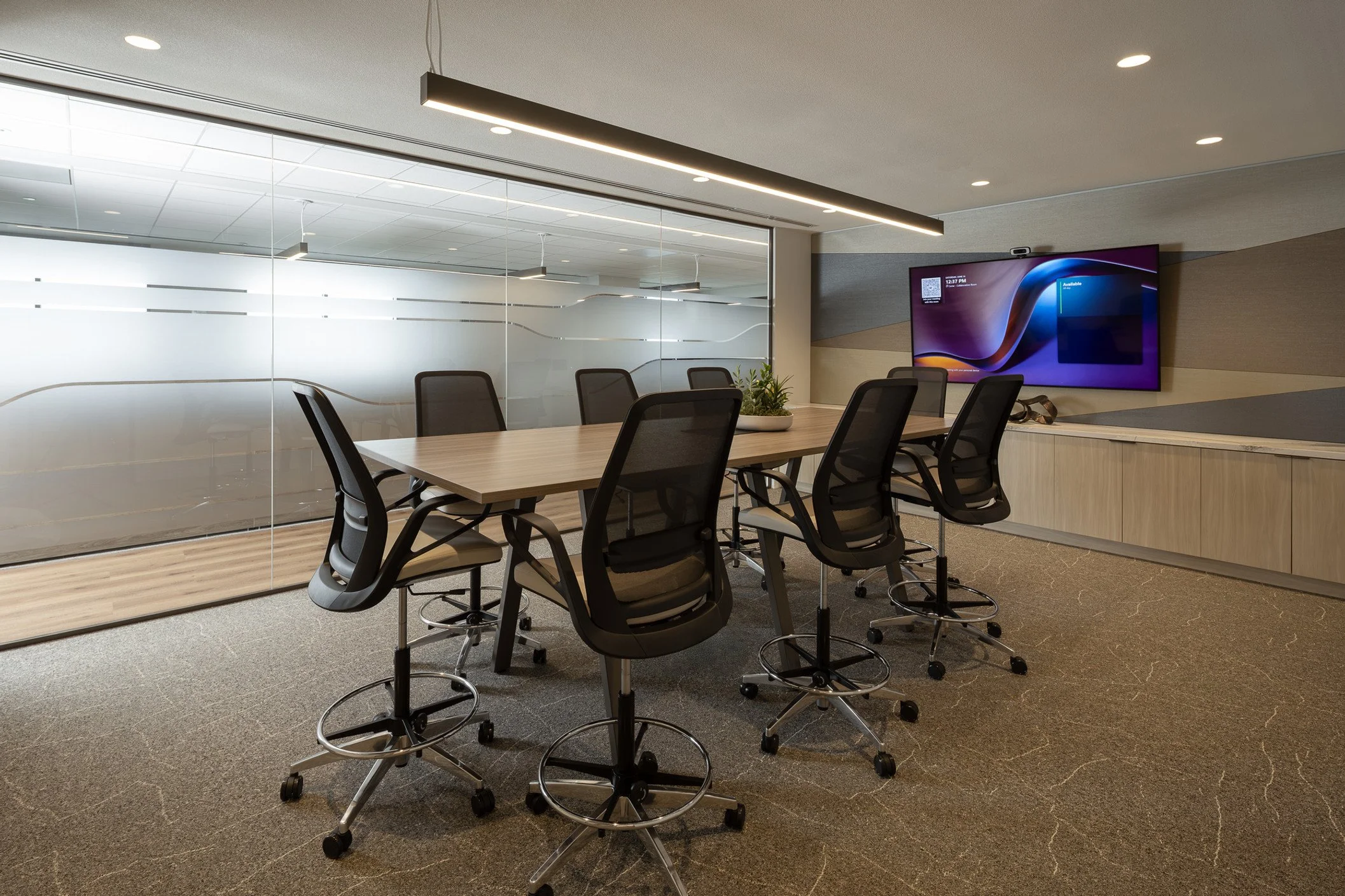 Throughout the office, subtle moments of movement echo the brand and the business. Frosted architectural graphics were designed to visually communicate the geological layers of the earth, adding energy while maintaining openness and privacy. ADA room IDs and wayfinding are clean and intuitive. Rounded shapes provide connection to the business, while color and finish reflect the refined office environment. Even individual desk markers contribute to a sense of cohesion—small details that reinforce a larger narrative.