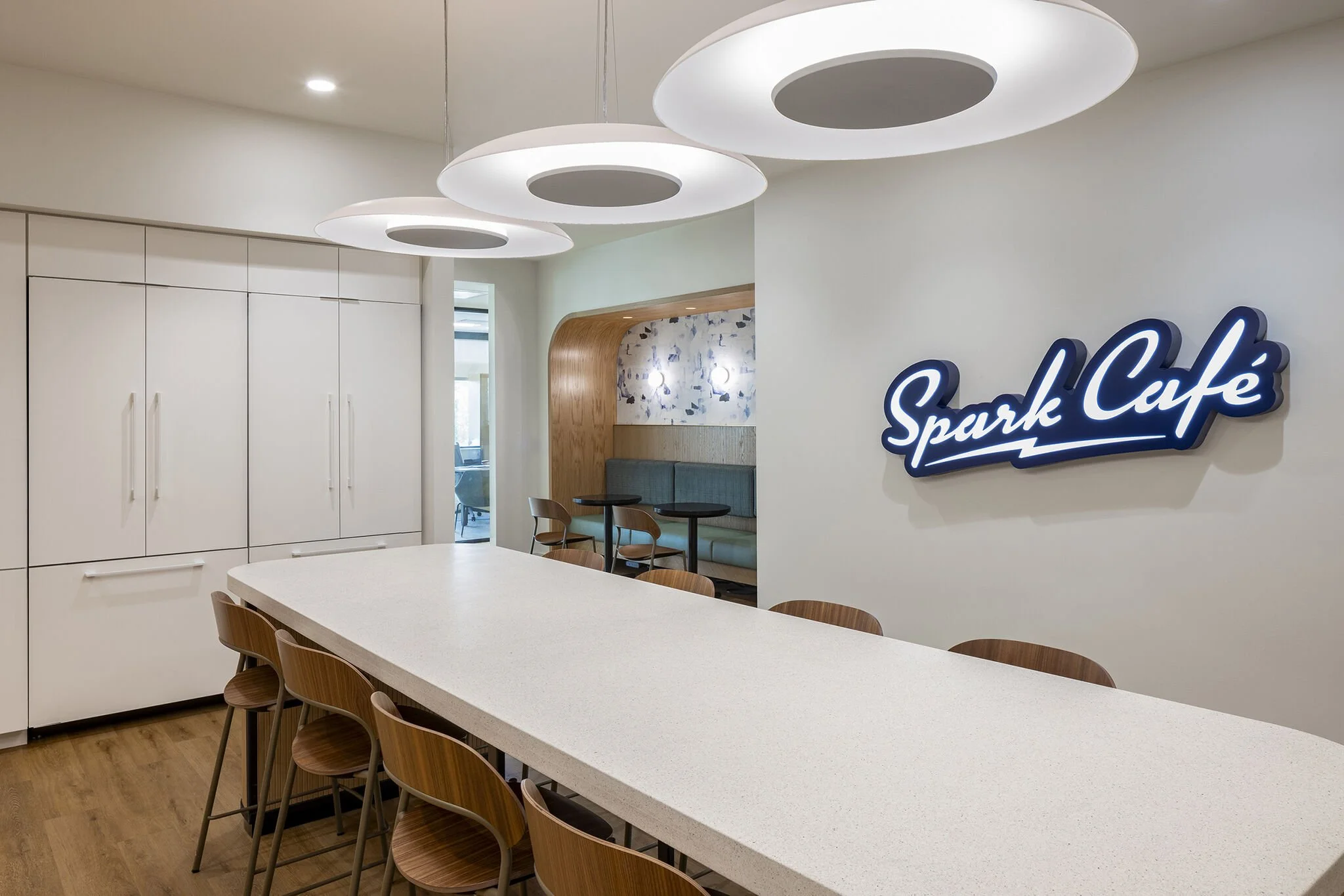 This location offered multiple opportunities for brand elevating signage. From the community center to the lobby coffee bar to the break room, we developed subtle illuminated and non-illuminated signs that aligned with their environments to avoid feeling overly branded or visually loud. Upstairs in the Executive suites, rather than leaning into signage that reads as commercial, we introduced a refined gold frame with just the Keystone logo mark in edge-lit routed acrylic. The interior signage was designed to deliver a sophisticated brand impression while effectively showing consideration for guests, Team Members, and Executives who are in the space daily.